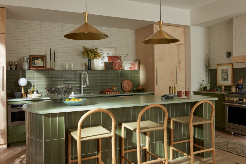 Striking backsplash tiles, like Raku™ glazed ceramic shown here, create a captivating focal point in an open floor plan kitchen. Extending the design by wrapping the island in corresponding tile adds a unique touch, while the olive tones beautifully contrast with light wood and crisp white surfaces. The space feels taller, brighter, and perfect for entertaining.