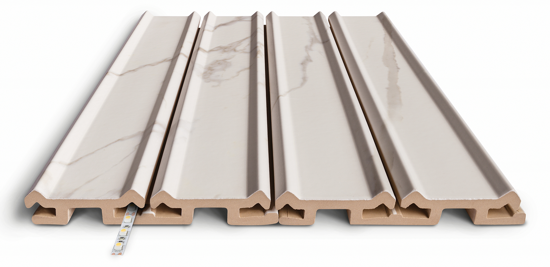 Flexible LED strips are inserted into the channels of the porcelain tiles.