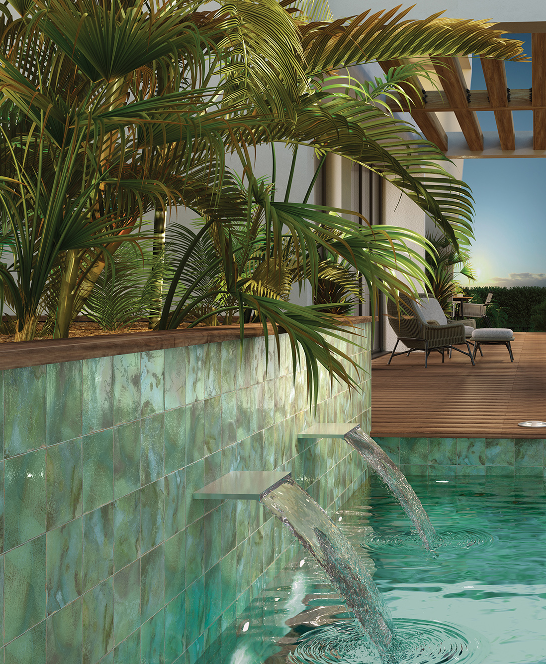 Tiles for outdoor projects continue to gain significance as more individuals look to entertain, relax, and exercise in the open air. A refreshing choice for pools is the green palette featured within the Immerse™ series.