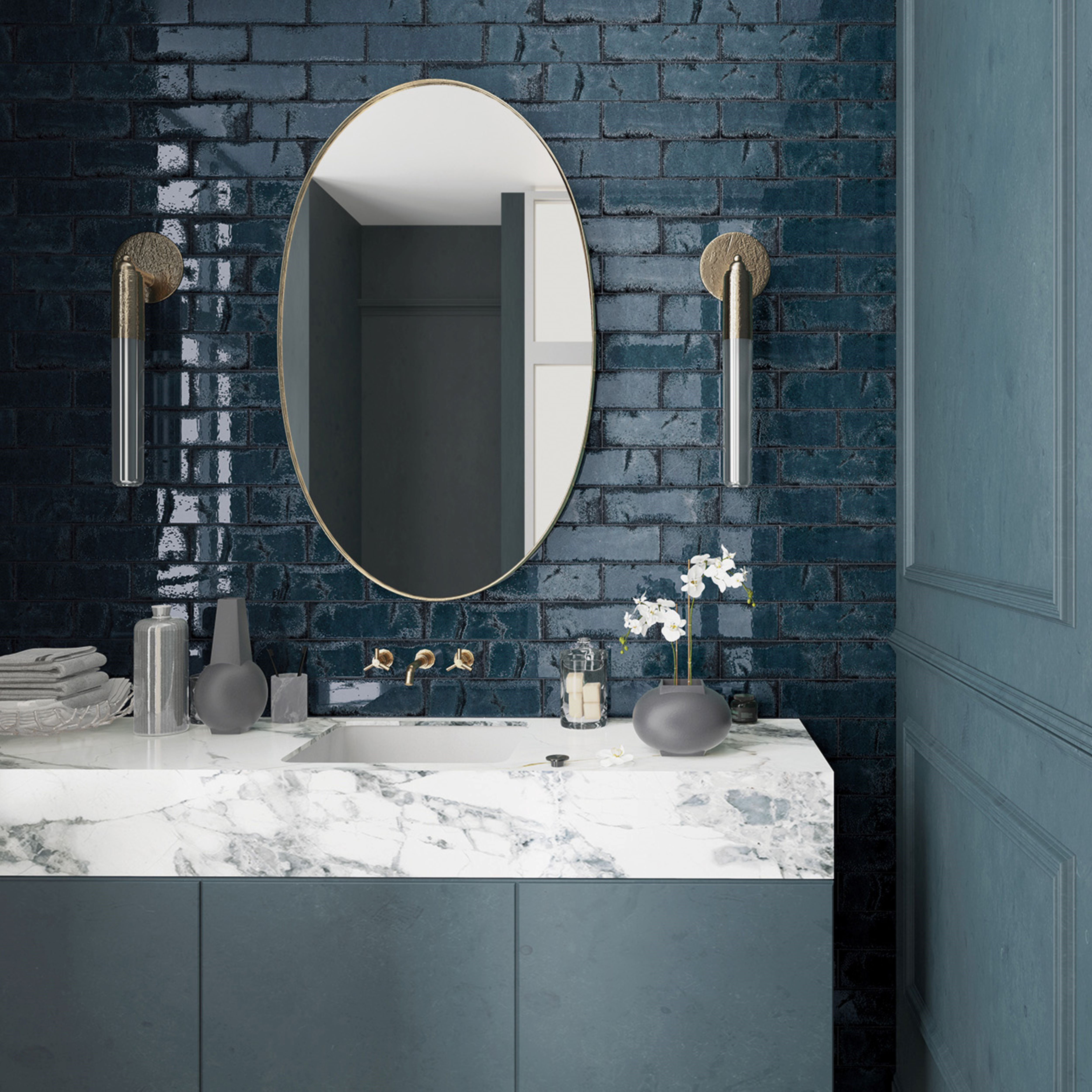 Pops of colors often find their way into powder rooms or guest baths. Here, the glistening effect of Inhale™ enlivens the space.